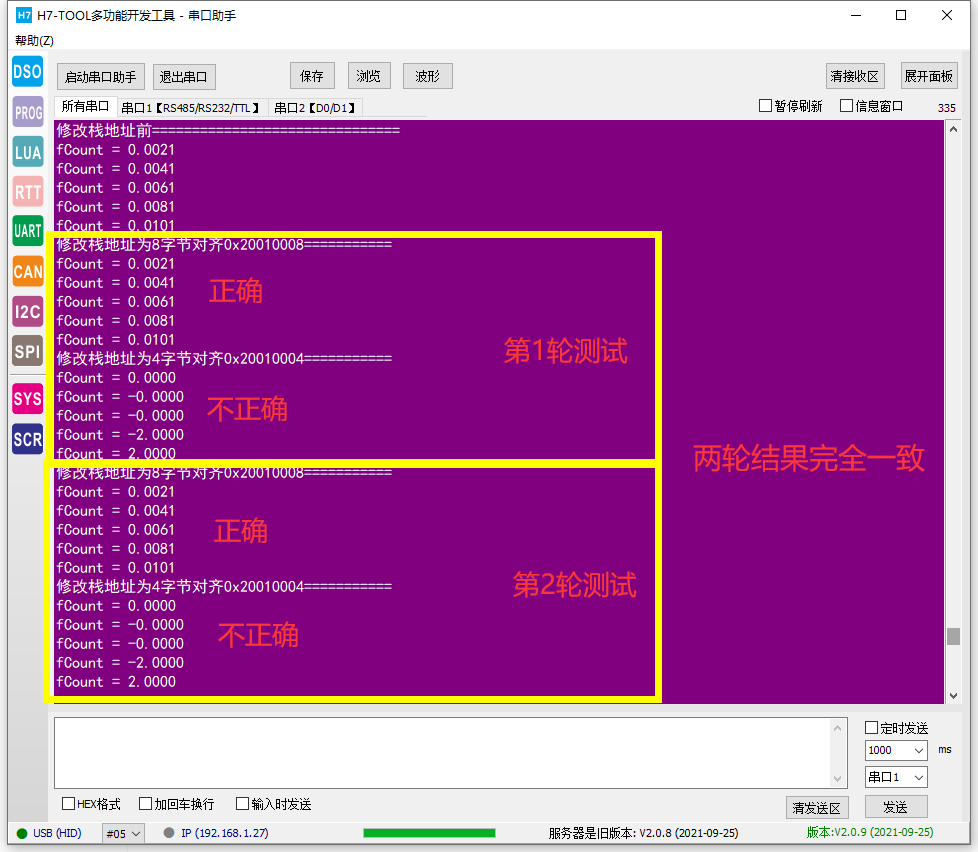 那么问题来了,我们搞个4对齐是不是会出问题,一般情况下也没问题的,但特殊情况下不行,特别调用C库的sprintf和printf函数,直接给你输出个不知所以然的结果来。比如我在H7上做如下测试: