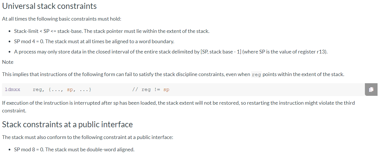 上面这个贴图最重要,仅需理解上面这两条就可以,意思是说,栈地址是全程至少保持4字节对齐的,因为M内核的硬件长做了处理,SP最低两个bit,bit0和bit1直接固定为0了。