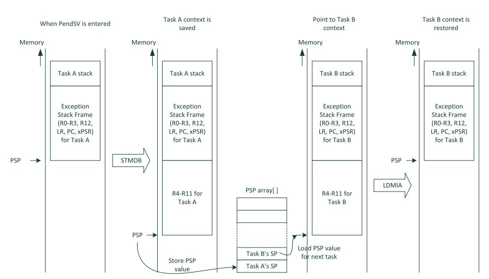 RTOS的任务栈涉及到双栈指针问题,SP(R13寄存器)有两个栈指针,MSP主栈指针和PSP进程栈指针。简单的说,我们在中断服务程序里面都是用的MSP,而任务里面用的PSP。