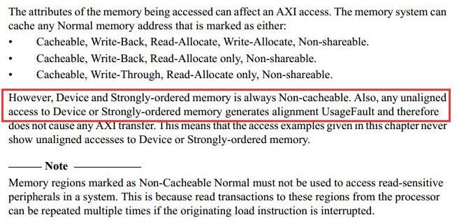 意思是,如果用户使用MPU将H7的AXI总线下的内存空间配置为Device 或者 Strongly-ordered模式,用户采用非对齐方式访问,将会触发UsageFault