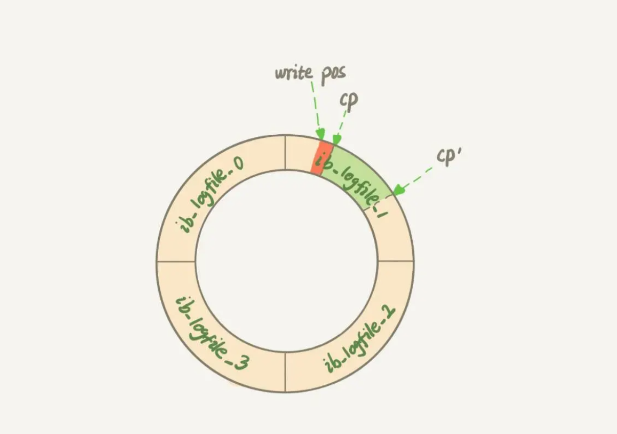 checkpoint可不是随便往前修改一下位置就可以的。比如图2中,把checkpoint位置从CP推进到CP’,就需要将两个点之间的日志(浅绿色部分),对应的所有脏页都flush到磁盘上。之后,图中从write pos到CP’之间就是可以再写入的redo log的区域。