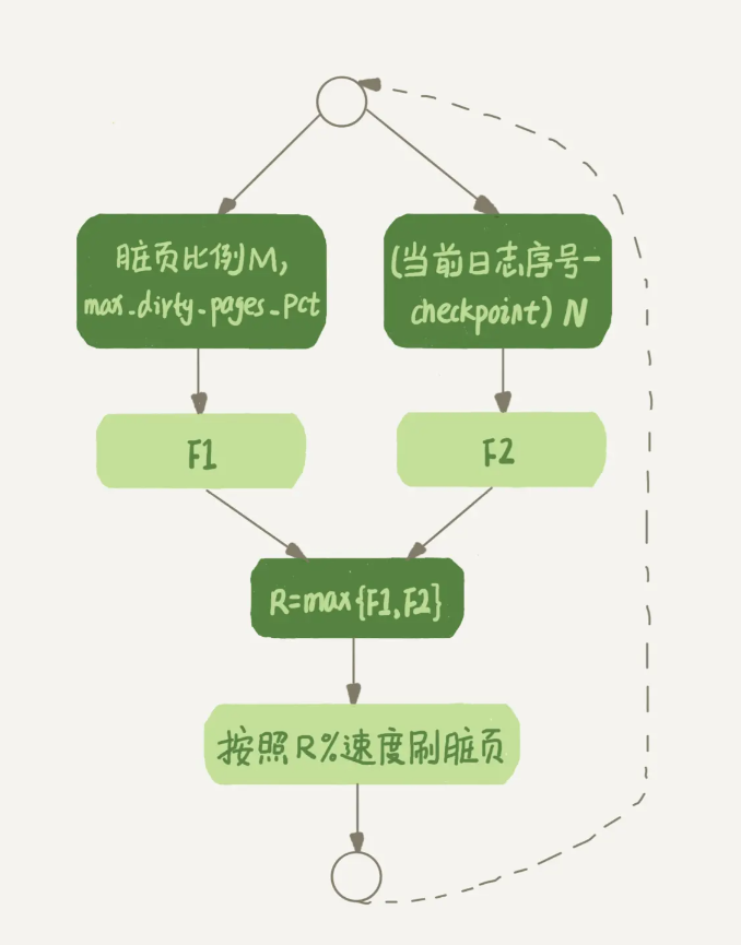 然后,根据上述算得的F1(M)和F2(N)两个值,取其中较大的值记为R,之后引擎就可以按照innodb_io_capacity定义的能力乘以R%来控制刷脏页的速度。