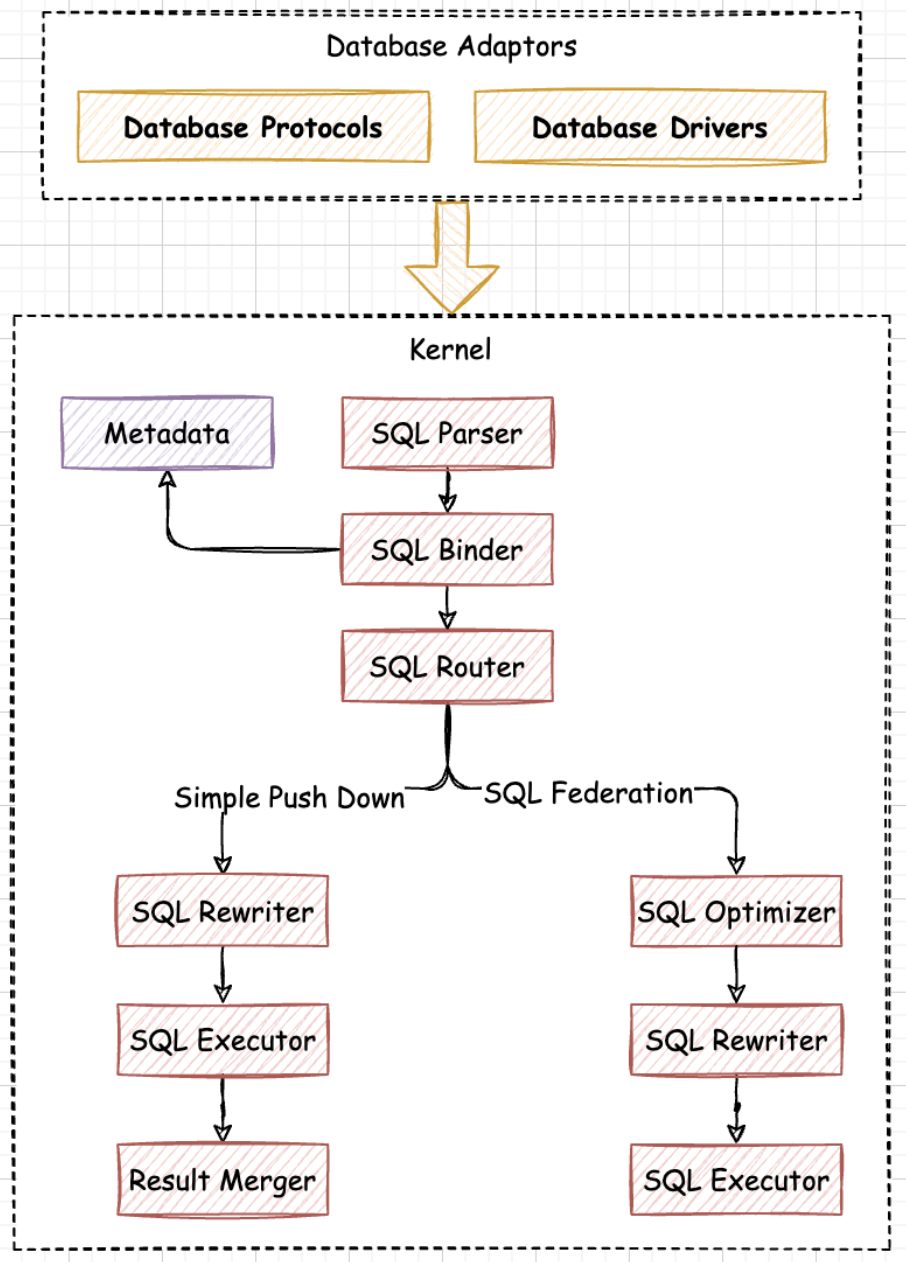 Apache ShardingSphere 5.0.0 GA 版提出了全新的 Database Plus 理念,目标是构建异构数据库上层标准和生态,为用户提供精准化和差异化的能力。据分片、数据加解密及分布式事务等增量功能。另外,通过可插拔平台,Apache ShardingSphere 提供的增量功能能够无限扩展,用户也可以根据需求灵活进行扩展。Database Plus 理念的出现,使得 ShardingSphere 真正意义上从一个分库分表中间件蜕变成为一套强大的分布式数据库生态系统。通过践行 Database Plus 理念,基于可插拔平台提供的扩展点,Apache ShardingSphere 内核也进行了全面地可插拔化改造。下图展示了全新的可插拔架构内核: