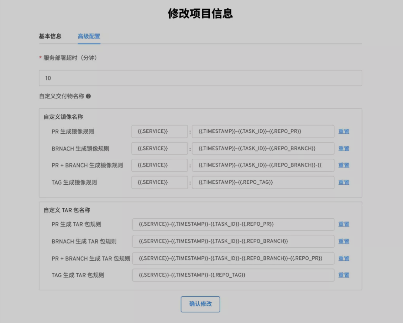 在项目的高级配置中,支持通过以下变量和常量组合的方式生成镜像、TAR 包的名称规则。