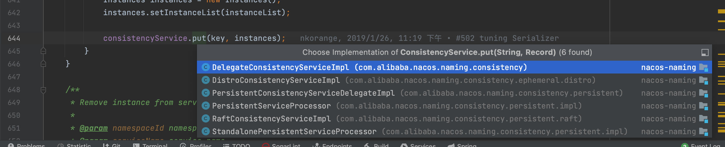 看下addInstance的实现,如下,前面的几行代码目的是生成instances,然后传入consistencyService中,使用IDEA时可以看出consistencyService.put有很多的实现,到底是用的哪一个实现类呢?