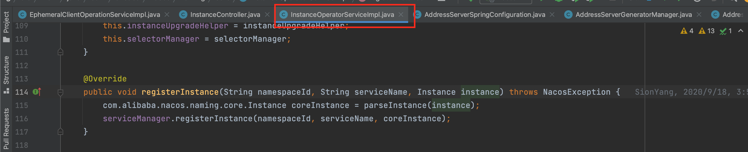 如上图中标注的1、2、3、4,可以看出1、2、3都是为了4,也就是解析request请求得到客户的传入的instance,所以下面进入4的实现中详细走读,不要在1、2、3做过多的停留。在registerInstance处右键进入实现代码,选择服务端实现即:InstanceOperatorServiceImpl