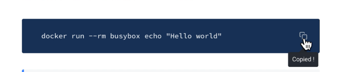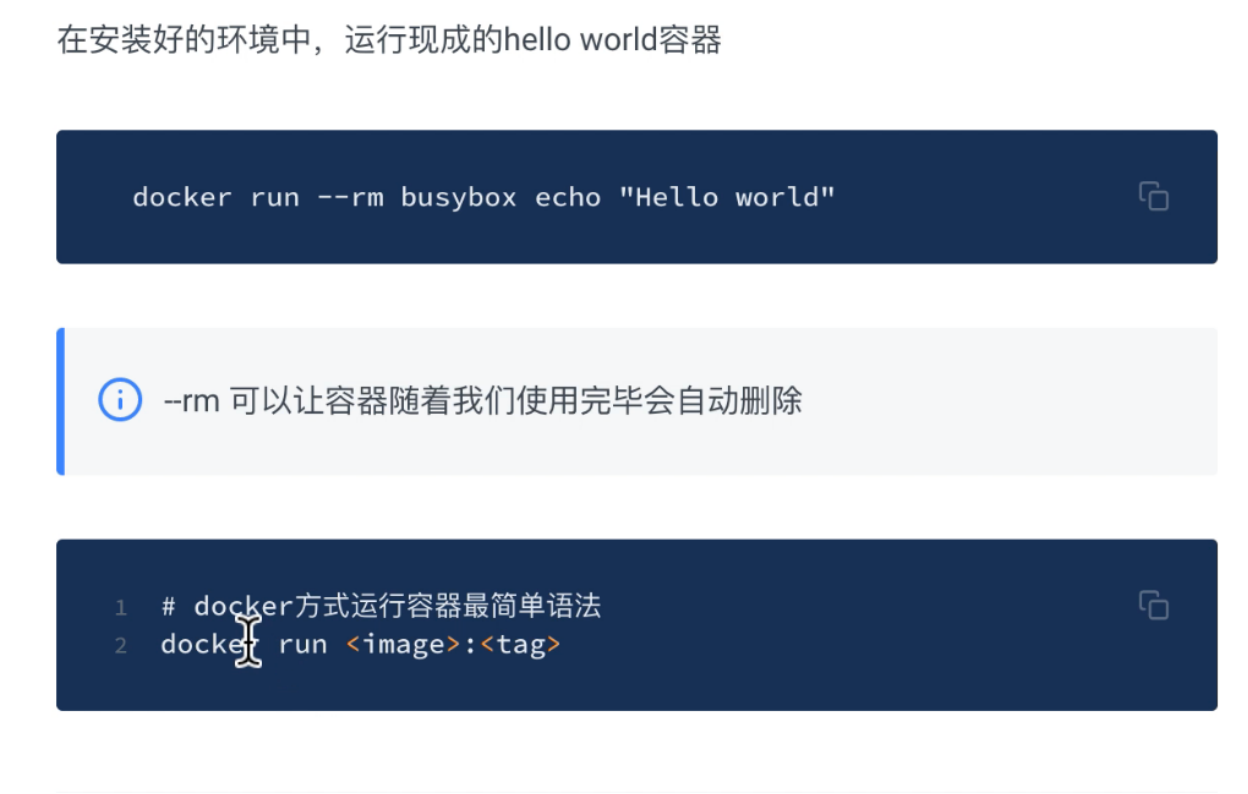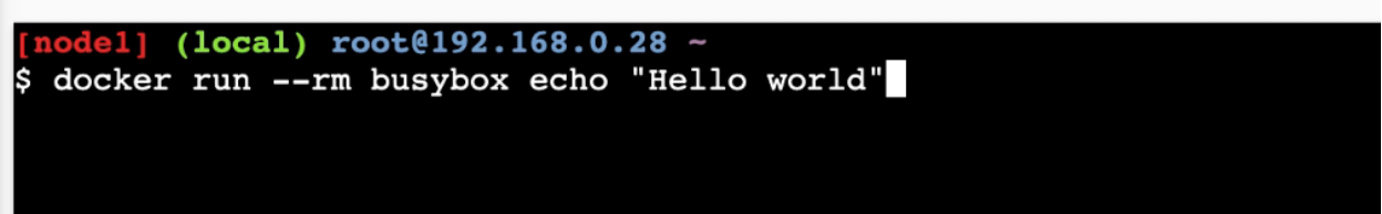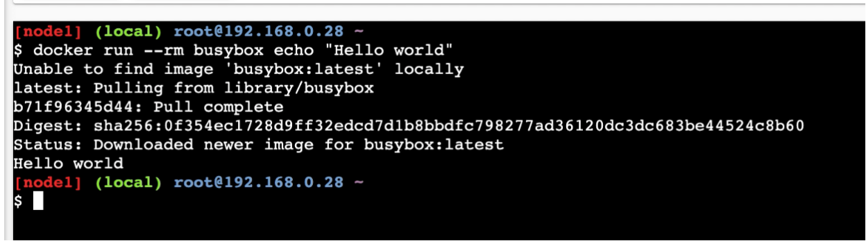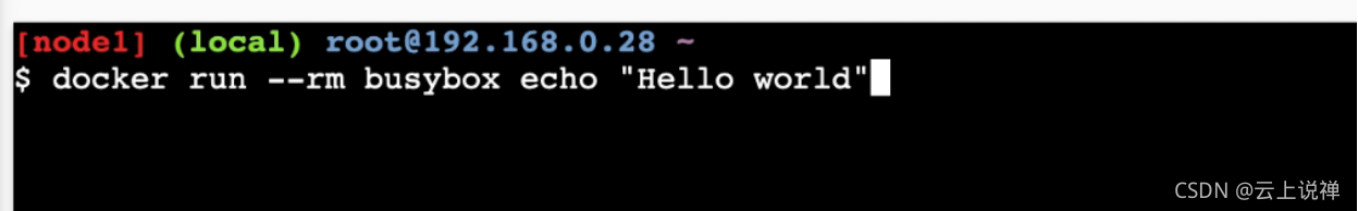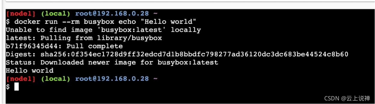 现在可以看到,我们使用了busybox镜像,执行了一个echo“Hello world” 的命令,所以在这里就直接pull了一个镜像,并且回显了Hello world。如此,我们完成了 “Hello world”指令。