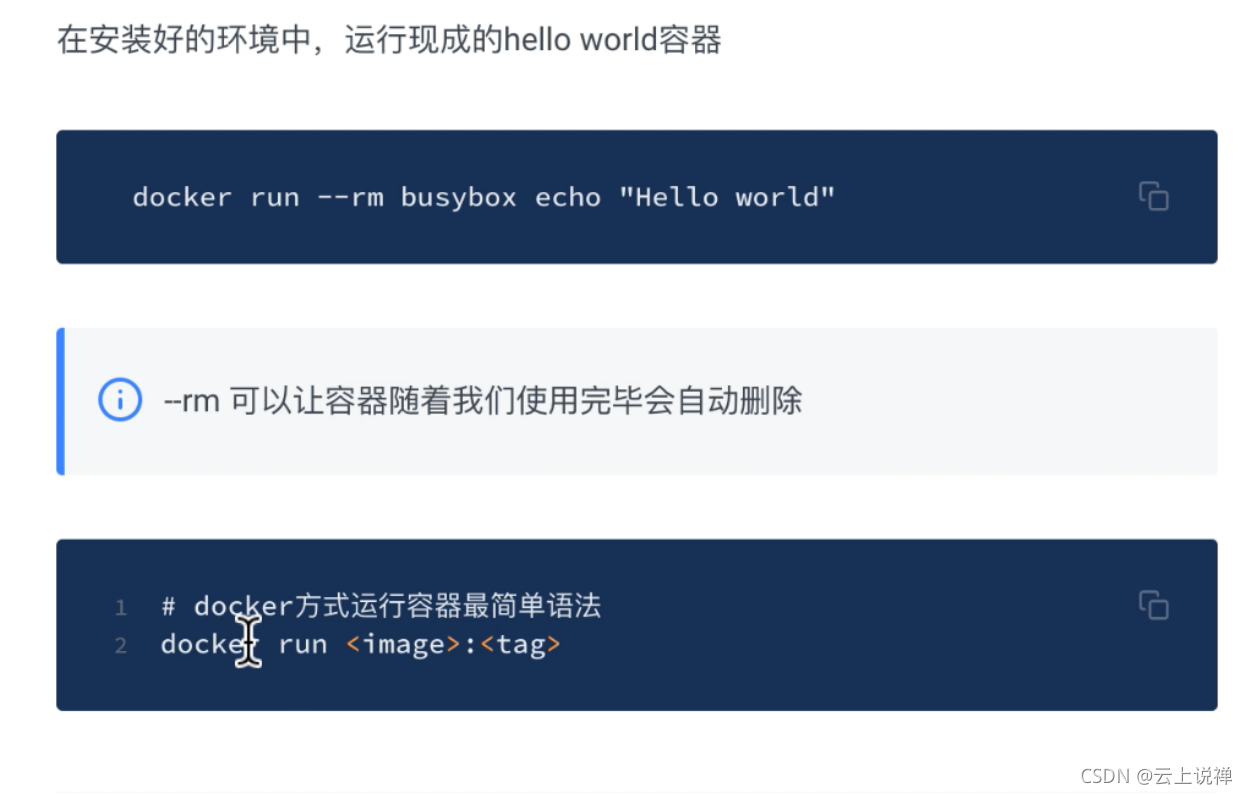 现在,正式开始体验Docker,让我们运行一下 “Hello world”容器: