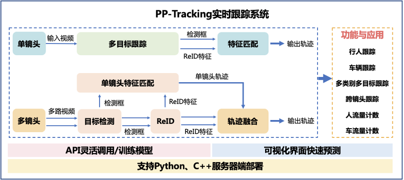 为了满足不同的开发需求,PP-Tracking 支持两种使用方式,无论是想通过代码调用/训练模型,进行快速推理部署,还是想要零代码直接上手使用功能,PP-Tracking 通通满足你!