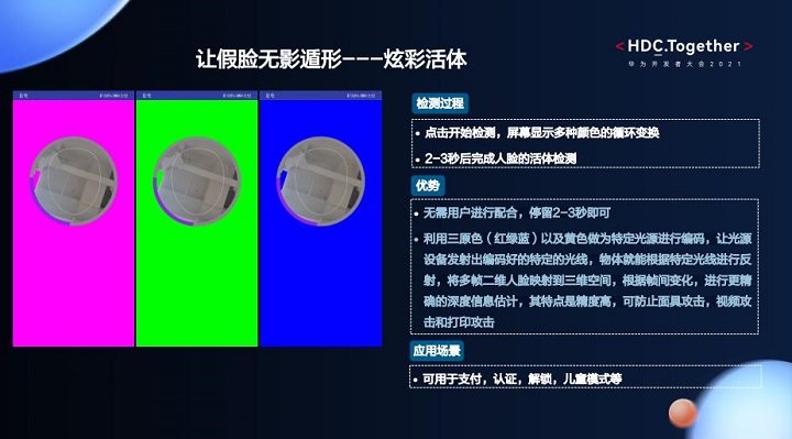- 炫彩活体是新技术,无需用户进行配合,停留2-3秒即可。它利用三原色(红绿蓝)以及黄色做为特定光源进行编码,让光源设备发射出编码好的特定的光线,物体就能根据特定光线进行反射,将多帧二维人脸映射到三维空间,根据帧间变化,进行更精确的深度信息估计。其特点是精度高,可防止面具攻击,视频攻击和打印攻击。适用于支付、认证、解锁、儿童模式等应用场景。