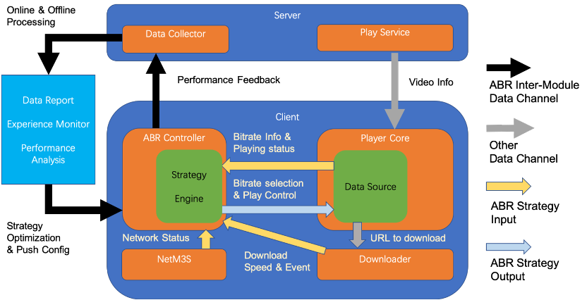 - 策略引擎框架: 支持多种策略实现运行的一个接口/环境/容器,每种算法策略实现根据从播放器内核和网络环境信息等输入,给定一个清晰度选择的输出;