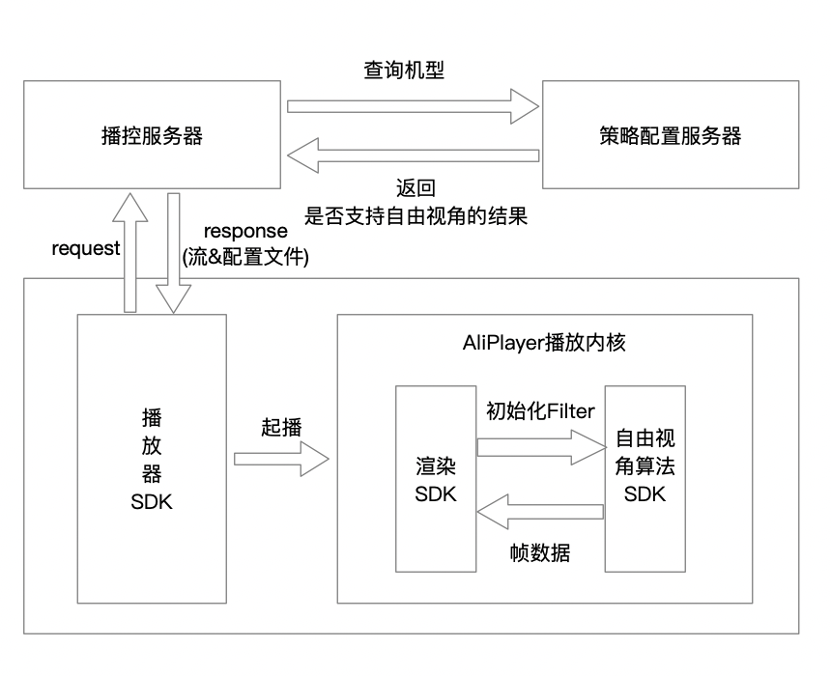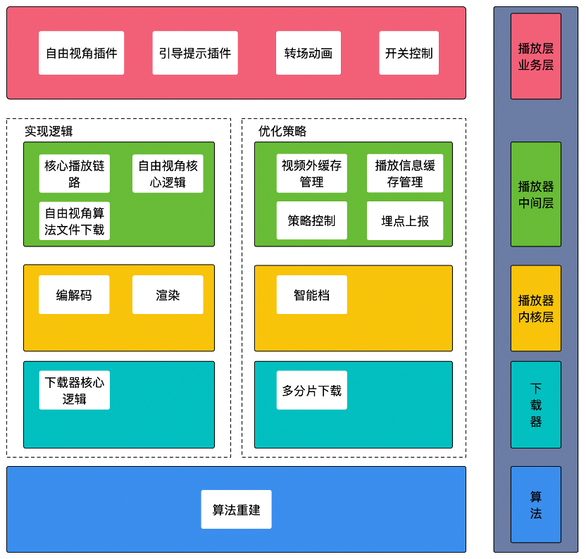 这部分主要会介绍自由视角实现的核心逻辑。中间由两个虚线框隔开的两个模块左边是自由视角在播放器SDK中实现的逻辑,右边是针对自由视角播放体验优化的策略,优化策略在后面会做详细的介绍。