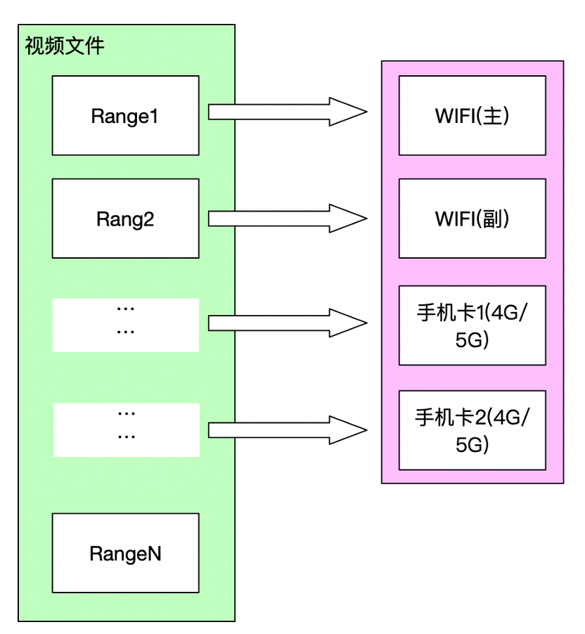 如上图所示,多通道下载技术通过将每个独立的文件拆分成N个小块进行下载,每个小块对应右图一个下载通道,这样就可以通过多个通道并行下载,提高下载效率以达到降低卡顿的目标。