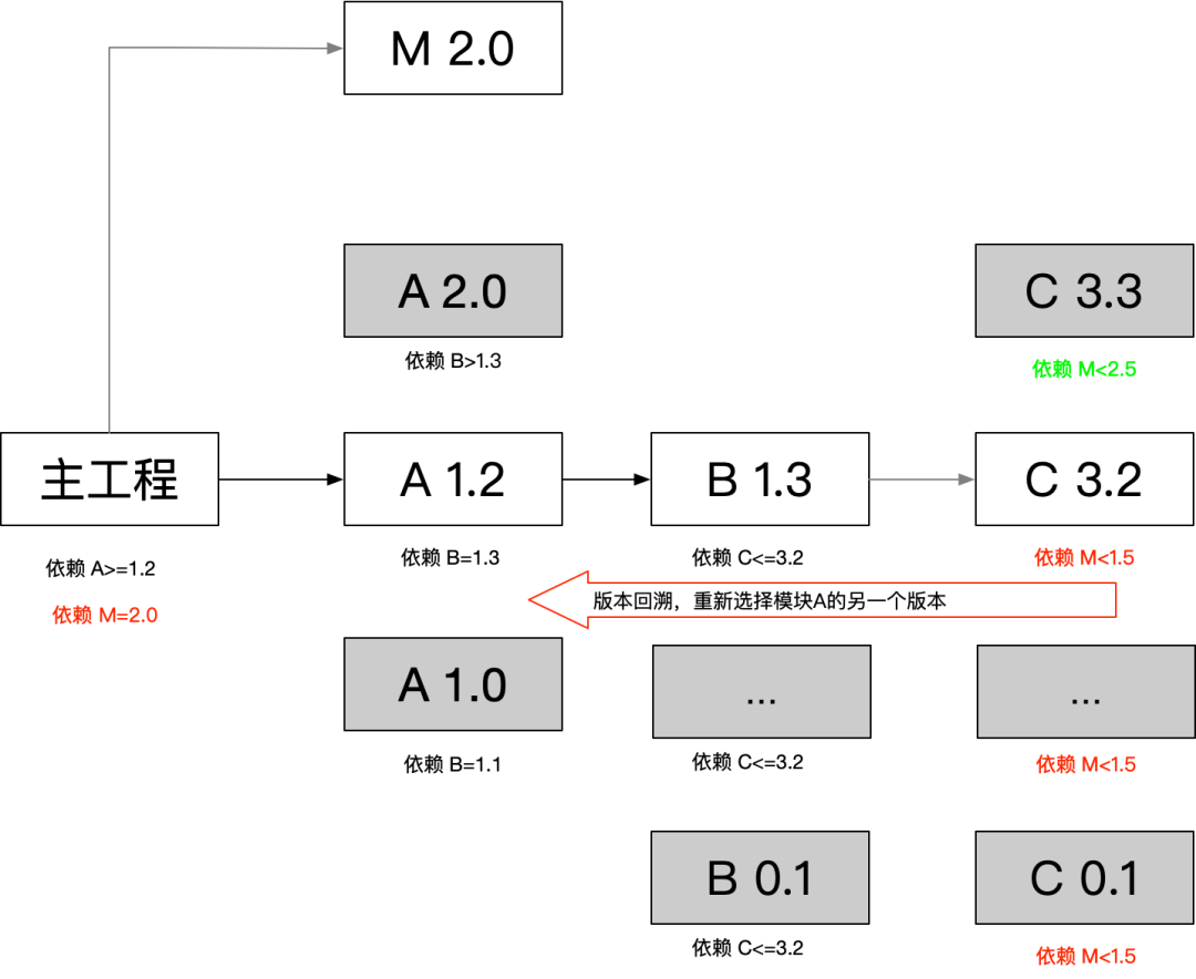 根据下图所示,当子节点C出现依赖冲突时,Molinillo会回溯到它的父节点B,重新选择父结点B的另一个版本,然后重新遍历它的子节点。如果父结点有许多子节点,深度遍历其他子节点也带来M倍耗时,M是深度遍历B子节点经过的所有节点数量。 父节点B的新版本可能声明了子节点C新的约束条件,这样就解决了子节点C的依赖冲突问题。