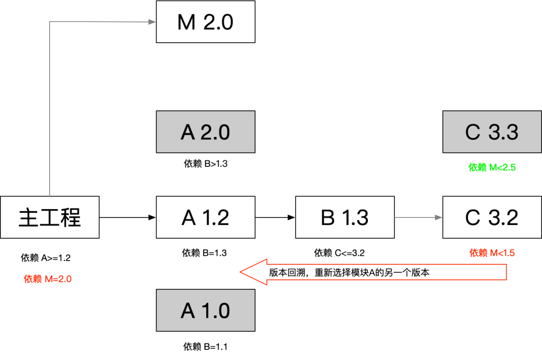 举个简单的例子例子,App声明模块M是2.6版本,然后又通过模块A间接依赖了模块B。因为模块B没有声明具体版本,Cocoapods选择了模块B2.0版本,但模块B的2.0版本依赖3.2以上的模块M版本,这个签名App声明的2.6版本冲突了,因此不能选择模块B3.2版本。Cocoapods会重新选择模块B其他版本,最后发现模块B1.0版本没有冲突。
