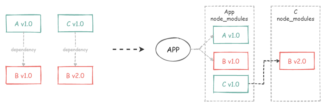 前端常用的包管理工具是npm,前端开发从来不会遇到包冲突的问题。npm利用语言特性实现依赖包隔离,这是一种冗余换取稳定的策略。当npm工程里出现传递依赖冲突时,各个节点会保留自己依赖的版本。这种策略可以避免依赖仲裁的冲突错误,运行时稳定性也高。但它会导致依赖地狱,包大小也会膨胀。