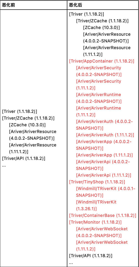 恶化的原因是 Triver/API 引发了依赖冲突。依赖图中有一个模块 Triver,它是被其他模块间接依赖的。Triver 有多个 subspec,其中有一个 subspec 是 Triver/API 。Triver/API 依赖了 MtopSDK 模块,并声明了 MtopSDK 的最小版本。Triver 最新的版本是1.1.18.2,它需要依赖 MtopSDK 2.5.1.0以上的版本,而主工程 Podfile 声明 MtopSDK为2.2.2.3的固定版本,因此出现了依赖冲突。