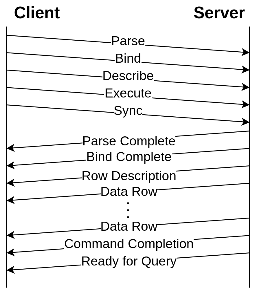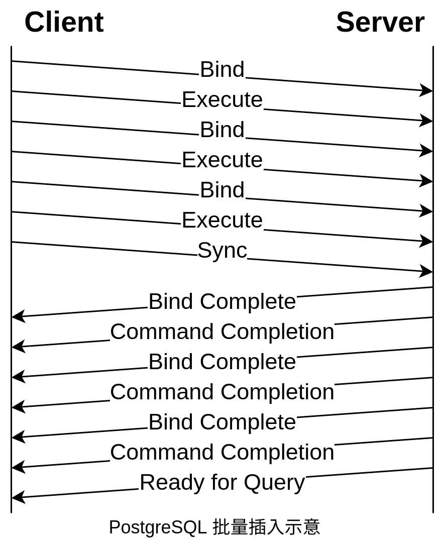 在 PostgreSQL 协议层面,Bind 消息每次能够传递一组参数形成 Portal,Execute 每次能够执行一个 Portal。执行批量插入可以通过反复执行 Bind 和 Execute 实现。协议交互示意图如下:
