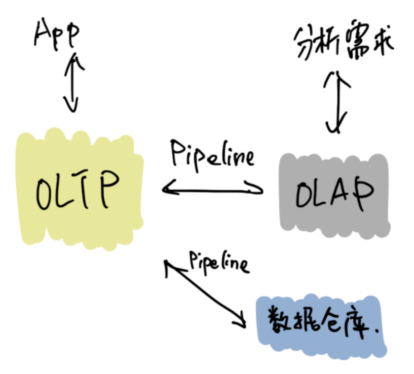 在我们当前绝⼤部分当前业务场景下,都是类似上图,都需要从 OLTP 系统将数据录入专⻔负责处理 ad-hoc 类分析的在线 OLAP,以及专⻔处理任务式计算的离线数仓。虽然图看的很简单,但是其中利⽤到的技术栈相当庞杂,在⽹易内部数科团队,DBA 团队,业务算法团队,中间件研发团队等多个团队全拴在这⼀个链路上,可以说是技术含量最⾼的业务链路之⼀。在业界相信很多公司也是类似的情况。