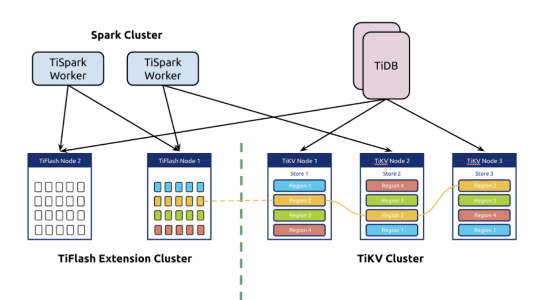 OLAP 部分非常专业的深度优化,例如 TiSpark 可借助类似 clickhouse 的向量化引擎,按照和 TiKV 相同的 coprocessor 协议下推任务到 TiFlash,提升资源利⽤和性能。