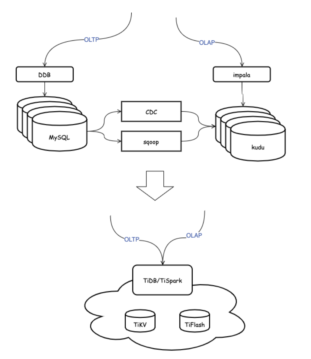 所以看着像是数据库技术间的世代竞争,其实也没这么复杂,对我们的现状来说,传统数据库 = DDB + MySQL,眼下的新⽣代 = TiDB。