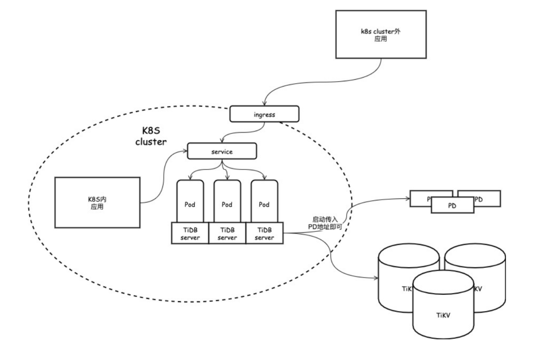⽅案三,由于 TiDB server⽆状态的良好特性,我们将 TiDB server 集群移植到了 K8s 内,作为⼀个 service 对 K8s 内外进⾏服务。