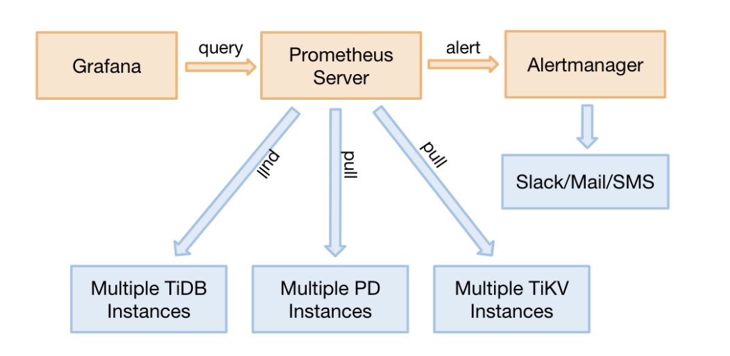 TiDB 各组件(除了图中⼏个主要服务外, 其他⽇志⼯具, 管理⼯具等配套⼯具都包括)均提供标准的 Prometheus 数据接⼝, 监控服务采⽤原⽣ Prometheus 拉取模式即可;另外 Grafana 有针对 TiDB 的完整模板, 并且区分度⾼, 同时数据逻辑联系强, 属于经过实践的⾼度有效模板。因此后续我们对 TiDB 监控展⽰和告警将直接使⽤原⽣⽅案, ⽽不 会迁移到哨兵或其他⾃建系统。并且报警系统对接当前 popo 或内部电话告警等接⼝也调试可⽤。