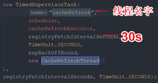 Eureka 每 30 s 会调用一个后台线程去拉取增量注册表,这个后台线程的名字叫做:cacheRefresh。如下所示: