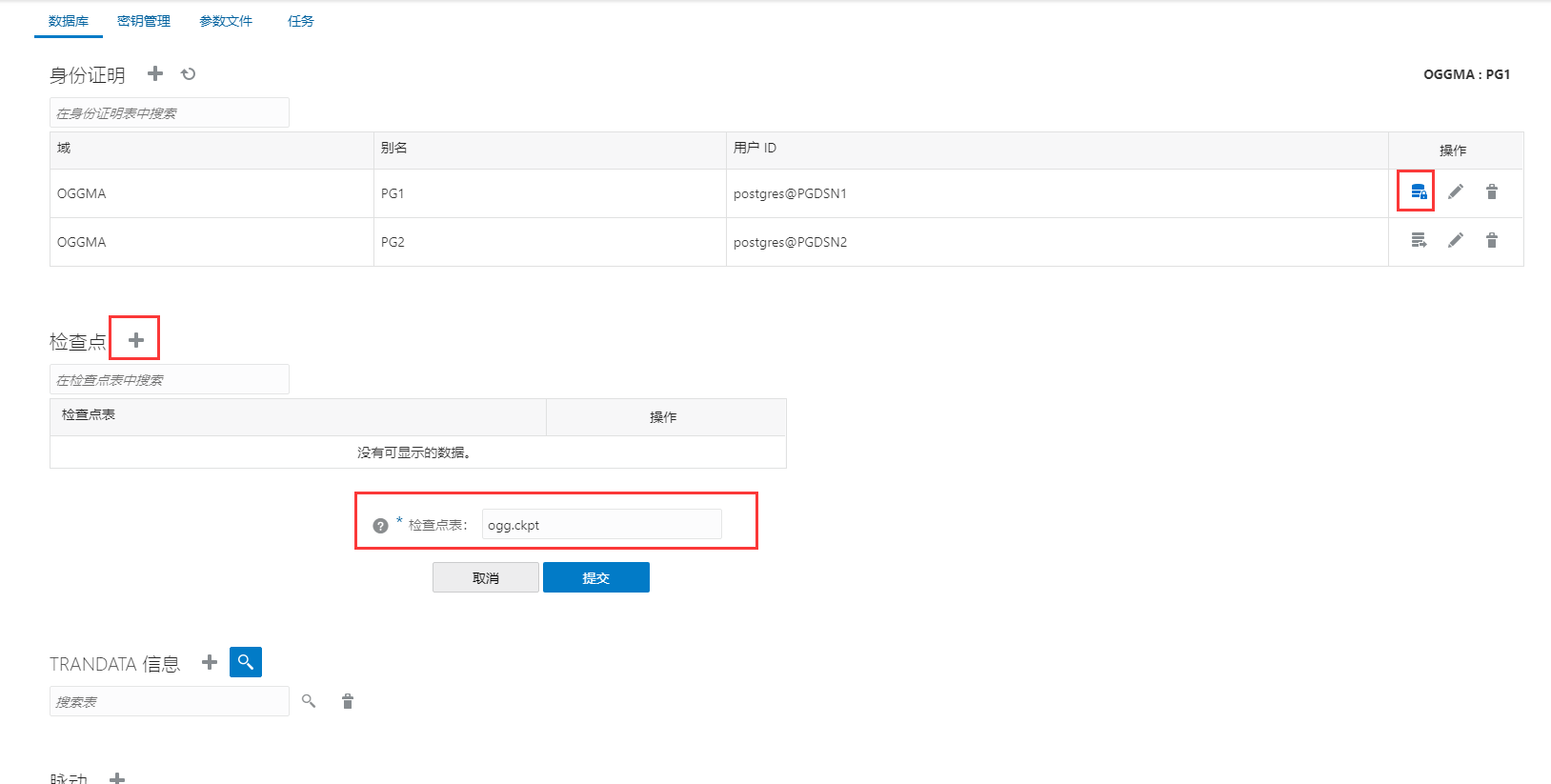 由于我们要配置双主,所以,这里的PG1和PG2都需要配置检查点表,否则只在目标端配置检查点表即可。