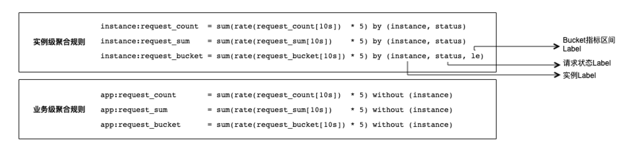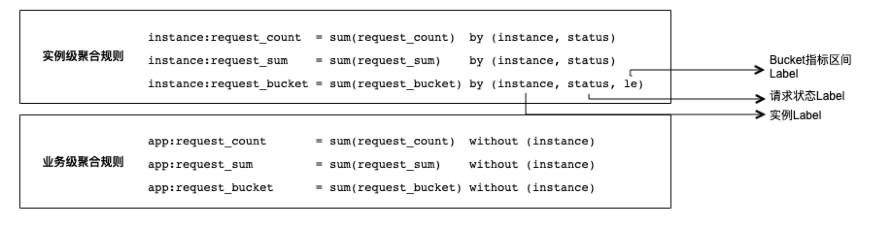 在做降维计算时,我们一开始想到了使用 sum 聚合函数。则根据之前所讲的聚合思路,分别聚合到实例级和业务级,可以写出如下的聚合规则: