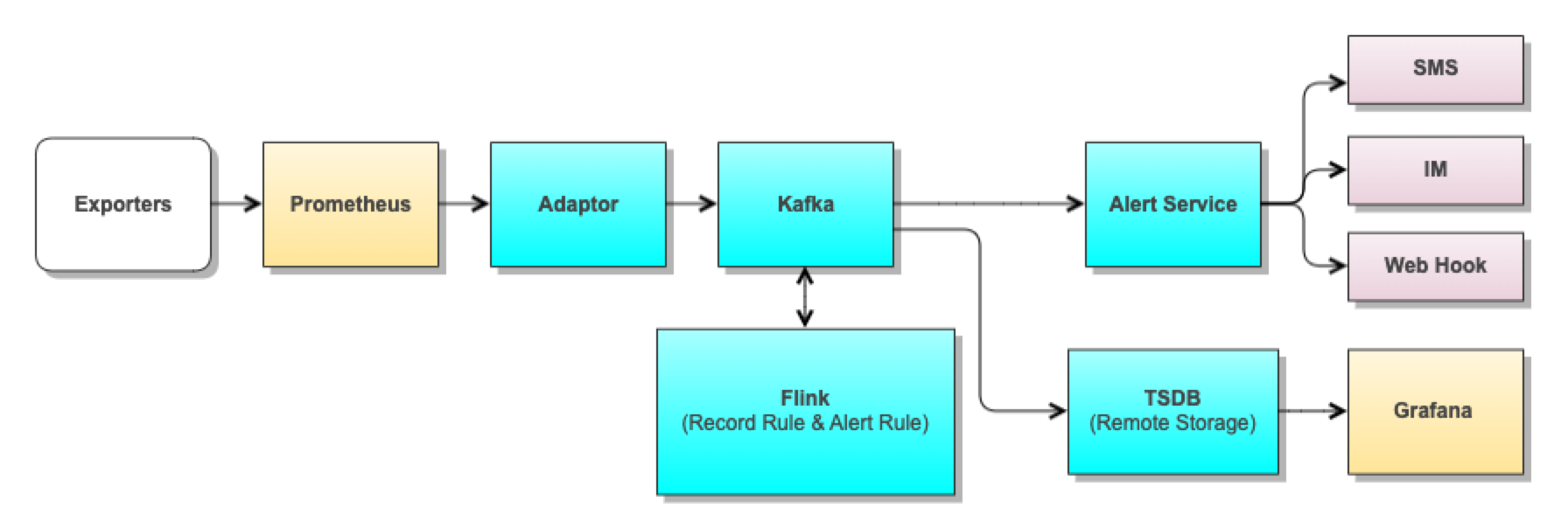 Prometheus 数据发送到 Adaptor 服务,Adaptor 服务负责将 Prometheus 发送的数据,转发到 Kafka 对应的 topic 中。Flink 流式计算服务及存储服务可以从 Kafka 中订阅所需的数据。