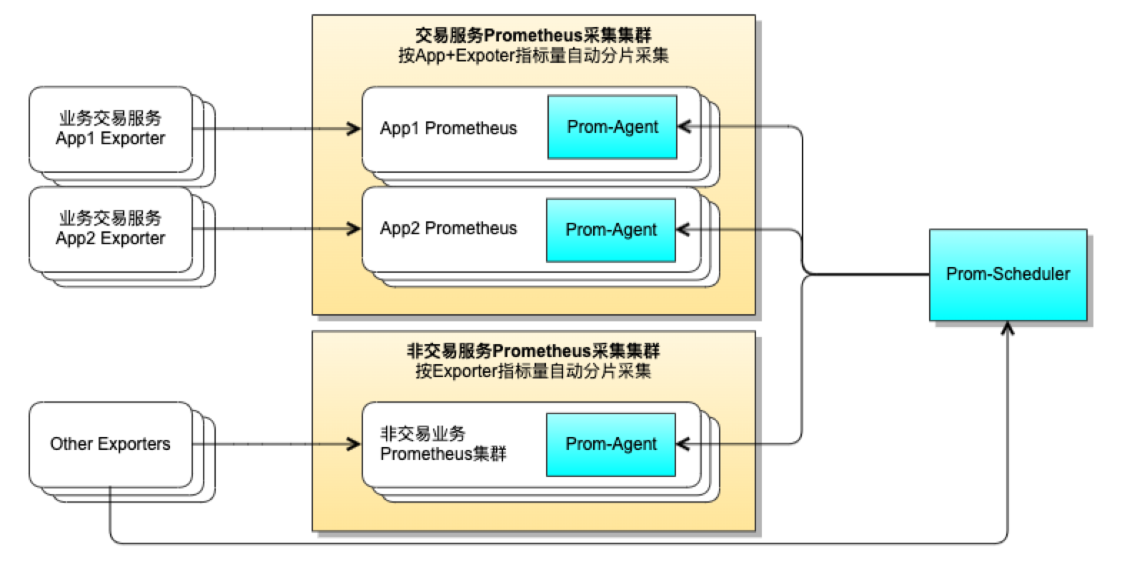 应对方法是建设独立的 Prometheus 采集分片管理服务,Prom-Scheduler 与 Prom-Agent 服务: