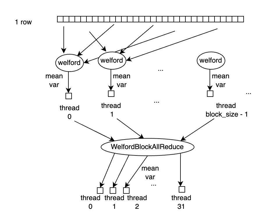 具体的处理流程是,如下图所示,每行有 num_cols 个元素,每个 warp 处理一行,因此每个线程需要处理 num_cols / warp_size 个元素,每个线程读取自己需要处理的元素存储到寄存器中,并用 Welford 算法计算好均值和方差后,Warp 中的所有线程执行一次 WelfordWarpAllReduce,这样每个线程上就得到了正确的均值和方差参与后续计算。