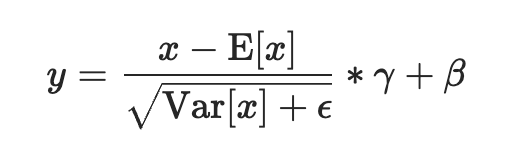 例如对于输入 x 形状为 (N, C, H, W), normalized_shape 为 (H, W) 的情况,可以理解为输入 x 为 (N*C, H*W),在 N*C 个行上,每行有 H*W 个元素,对每行的元素求均值和方差,得到 N*C 个 mean 和 inv_variance,再对输入按如下 LayerNorm 的计算公式计算得到 y。若 elementwise_affine=True ,则有 H*W 个 gamma 和 beta,对每行 H*W 个的元素做变换。