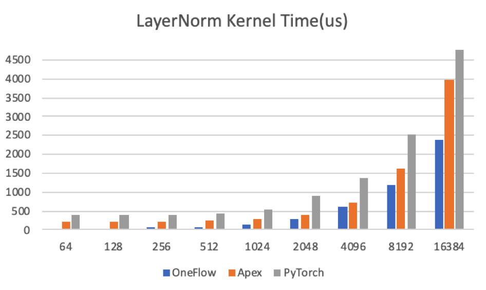 OneFlow 优化后的 LayerNorm 分别与 NVIDIA Apex、PyTorch 做了性能对比,测试结果显示,OneFlow LayerNorm 有明显的性能优势。