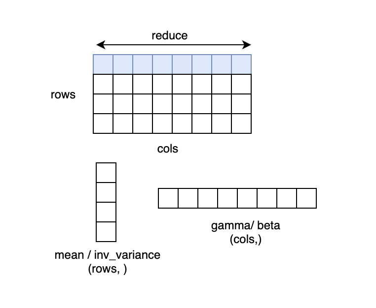 LayerNorm 是语言模型中常用的操作之一,其 CUDA Kernel 实现的高效性会影响很多网络最终的训练速度,Softmax 的优化方法也适用于 LayerNorm,LayerNorm 的数据也可以表示为 (num_rows, num_cols),计算过程中对每一行的元素做 Reduce 操作求均值方差。因此我们使用了和 Softmax 同样的优化方法来优化 LayerNorm 操作,本文以 LayerNorm 前向计算为例进行介绍。
