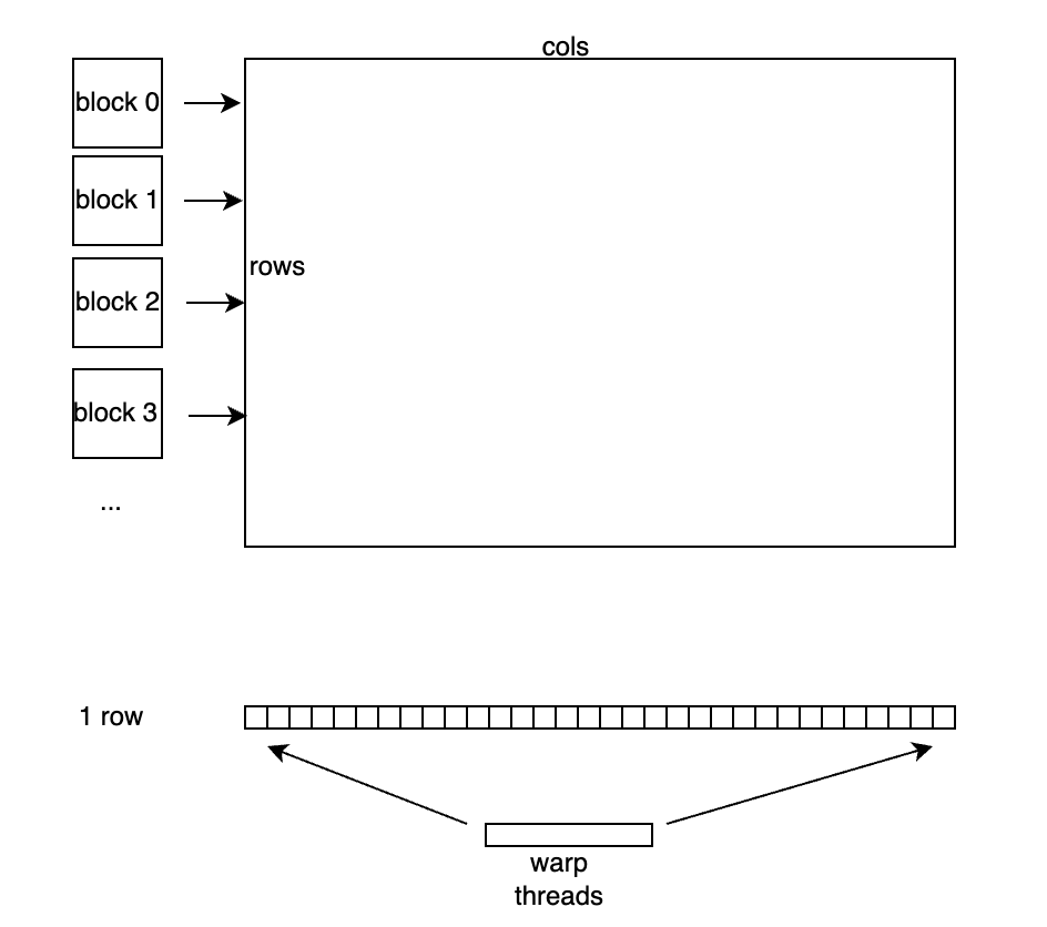 硬件上并行执行的32个线程称之为一个 Warp,同一个 Warp 的32个 thread 执行同一条指令, Warp是 GPU 调度执行的基本单元。线程块和元素的对应关系如上图所示,每个 Warp 的 threads 处理一行元素,每个 block 有 block_size / warp_size 个 Warp,每个 block 处理 block_size / warp_size 行元素。