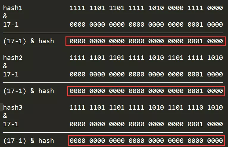 假如槽位数不是16,而是17,则槽位计算公式变成:(17 – 1) & hash