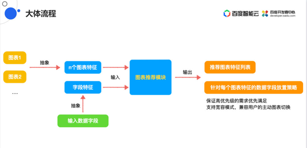智能图表首先是对系统内部100多种的图表进行抽象,从图表中提取特征。然后在图表推荐模块将图表的特征与当前用户输入的特征做一个匹配,之后推荐的图表有一个列表,并对列表中对每一个图表进行打分,最后进行排名将得分最高的图表推荐给用户。