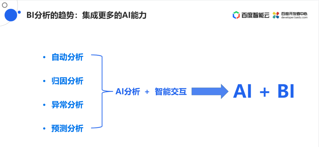 有了AI分析和智能化的交互,百度认为传统BI的发展趋势就是“AI+BI”的能力融合!
