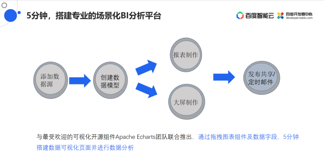 这样简单的步骤让用户非常容易就能搭建一个可视化平台。在这个过程中利用了百度可视化开源组件Apach Echarts,通过拖拽图表组件及数据字段的方式,在5分钟之内就可以搭建数据可视化页面并进行复杂的数据分析操作。