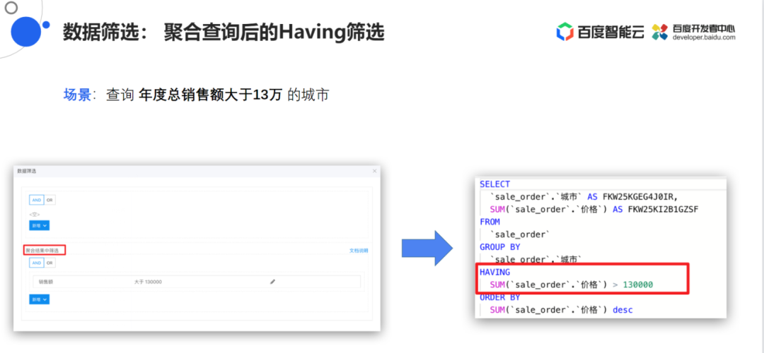 Sugar还支持聚合查询后的Having筛选,例如场景是查询年度总销售额大于13万的城市,对应到SQL语句的Having场景,是对数据聚合后再做一个筛选。