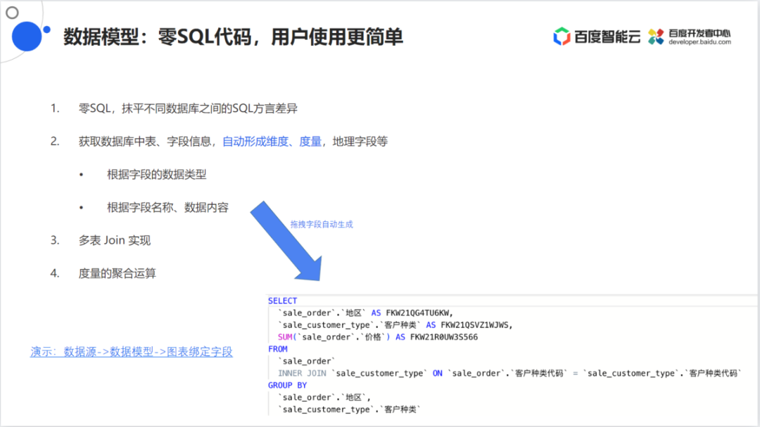 讲师在分享过程中,以“销售订单数据的展示“为例,演示了建立数据模型、数据可视化等操作。详细步骤可通过: https://developer.baidu.com/live.html?id=13 回顾。