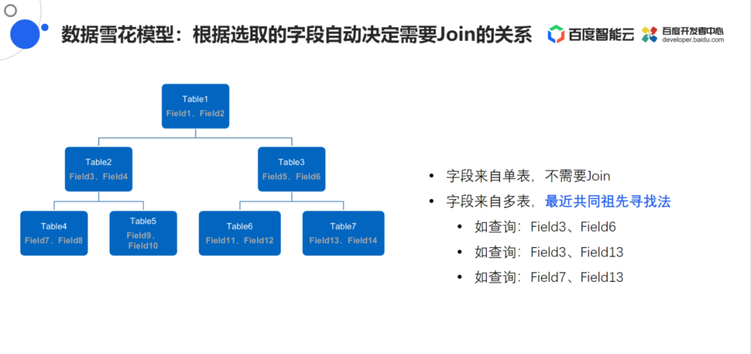 在Sugar中多表的Join使用的是雪花模型,可以自动的根据字段来选择Join的方式。使用最近共同祖先寻找法来解决查询的字段来自多个不同表的问题。