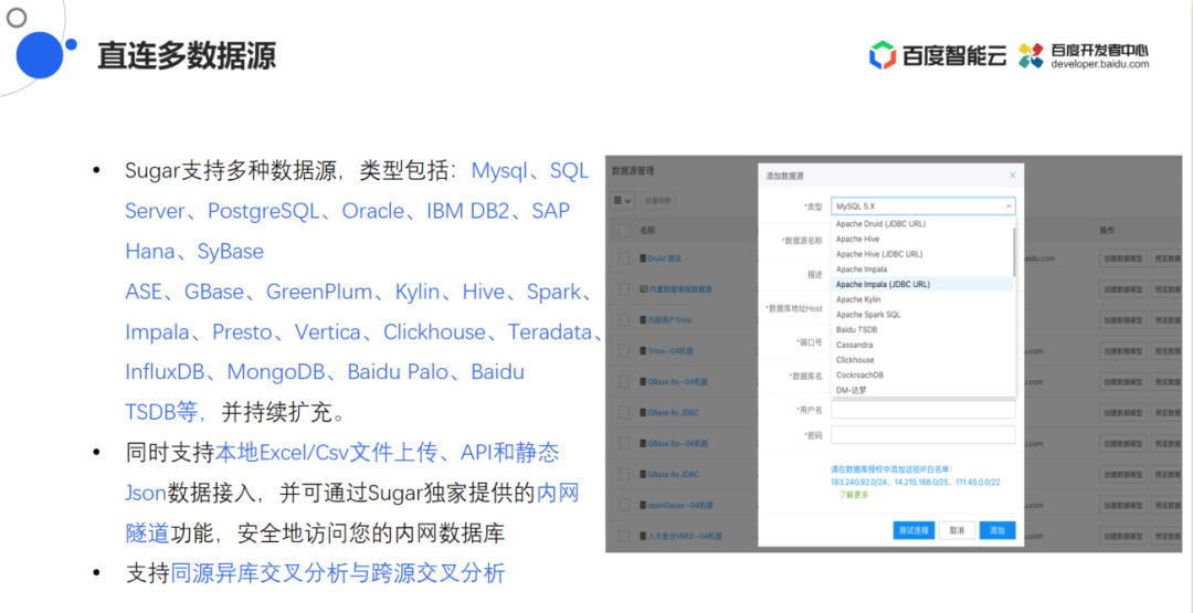 该平台还可以支持Excel/Csv数据的上传,同时还支持对接已有的API并且允许用户静态的输入Json代码来做效果展示。最后还开发内网隧道的功能,可以让内网中数据源的数据通过内网隧道的方式直接对接到云上Sugar的产品中。对于不同的数据源,比如MySQL和SQLserver,还支持两种数据源的跨源交叉分析。