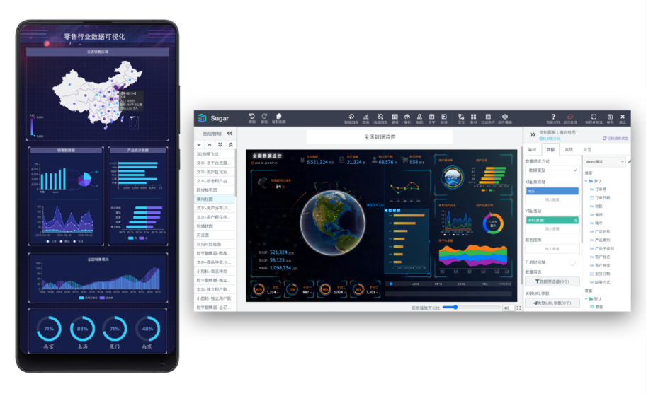 而在Suger BI产品中,借鉴了BI的做法,将BI与可视化大屏的进行融合。用户是 可以选择写SQL语句,也可以通过数据建模将数据通过拖拽的方式绑定到可视化图表上 ,所以Sugar产品的定位就是一个产品满足两个产品的需求。