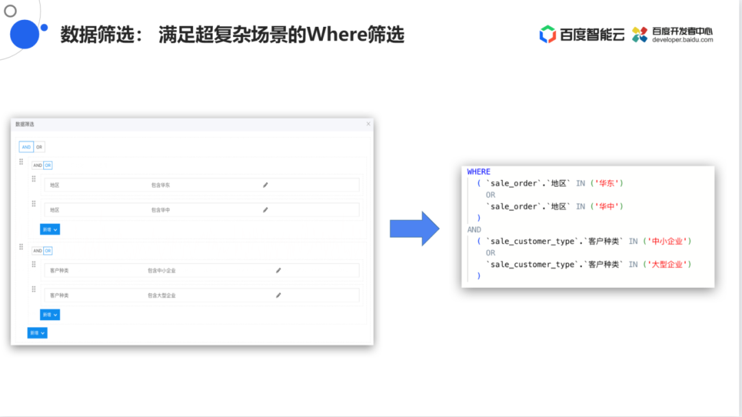 在复杂场景下做SQL的Where筛选,就是要对数据进行过滤,对于右边非常复杂的Where筛选,Sugar设计了左边的功能能够满足用户非常复杂的交互场景。