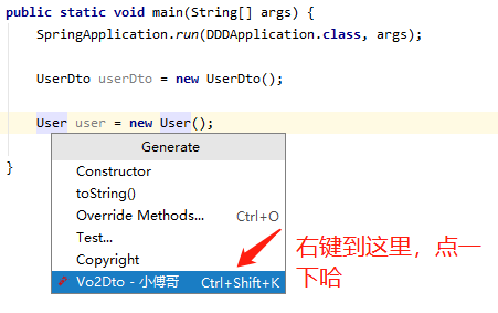 把鼠标定义到需要转换设置值的对象,之后鼠标右键,选择 Generate->Vo2Dto - 小傅哥