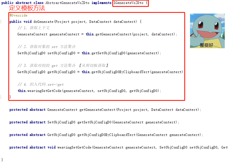 关于代码织入锚点前,我们在模板类中定义的方法,需要实现接口进行处理,重点包括: