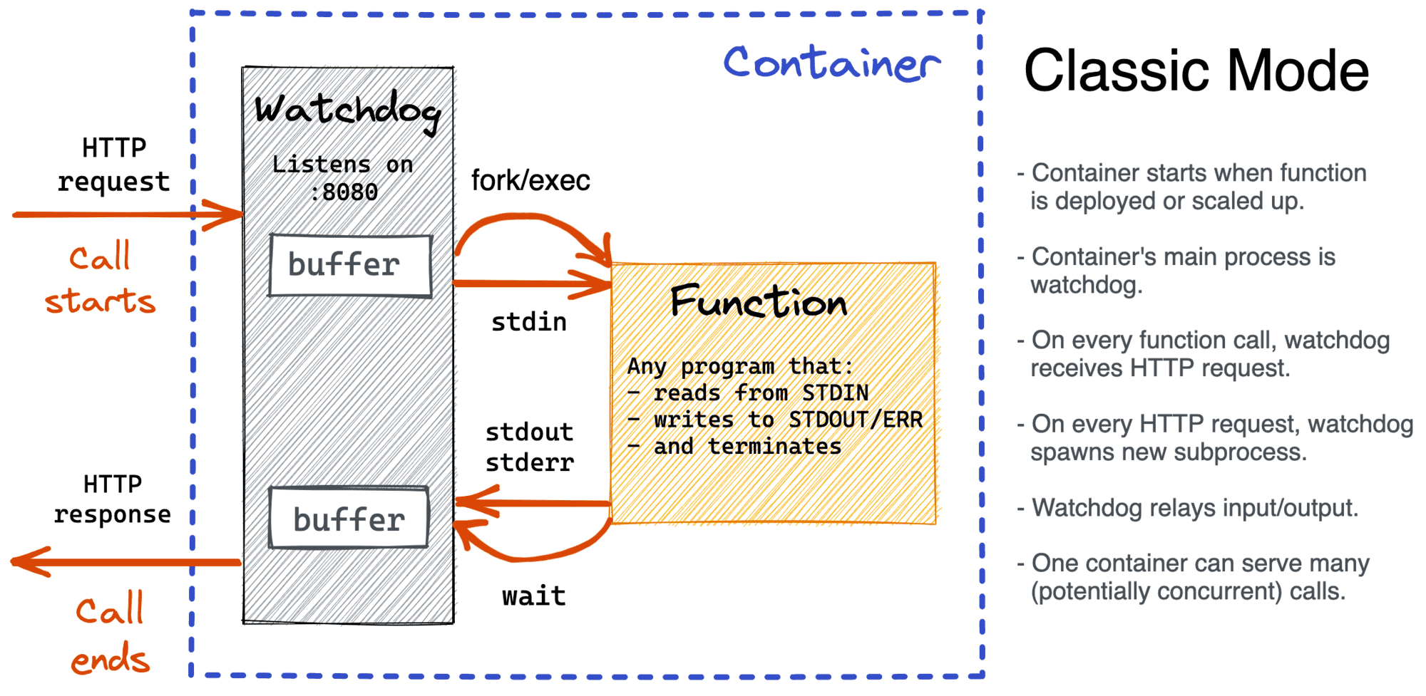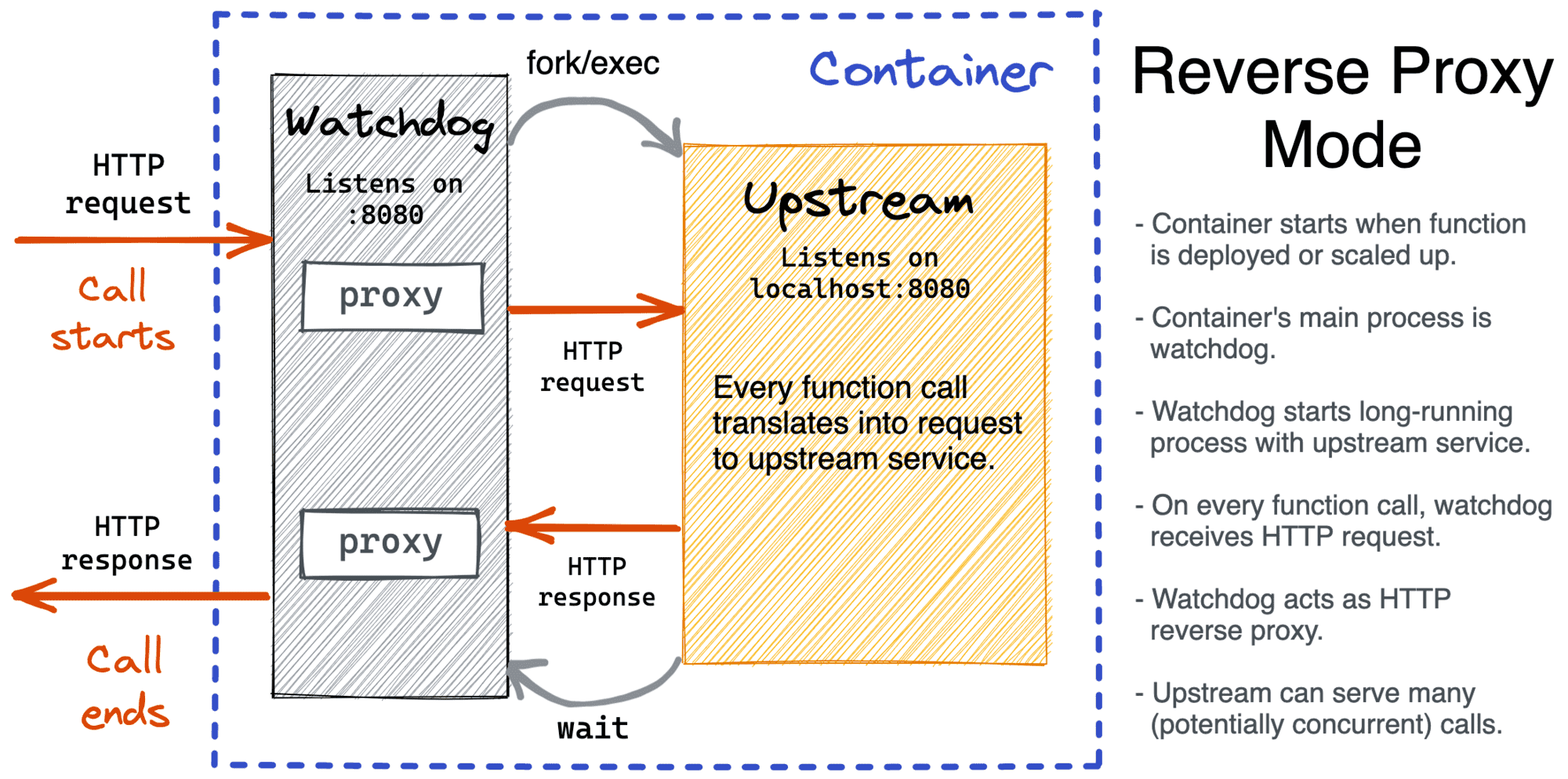 如果 经典 运行时类似于 CGI,那么这个运行时模式类似于后来的 FastCGI。运行时希望在 watchdog 后面有一个长期运行的 HTTP 服务器,而不是每次函数调用时创建新的进程。这本质上是 将 watchdog 组件变成反向代理: